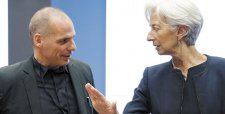 The Greek Finance Minister, Yanis Varoufakis talks with Christine Lagarde, head of the IMF, at the meeting of Eurogroup.